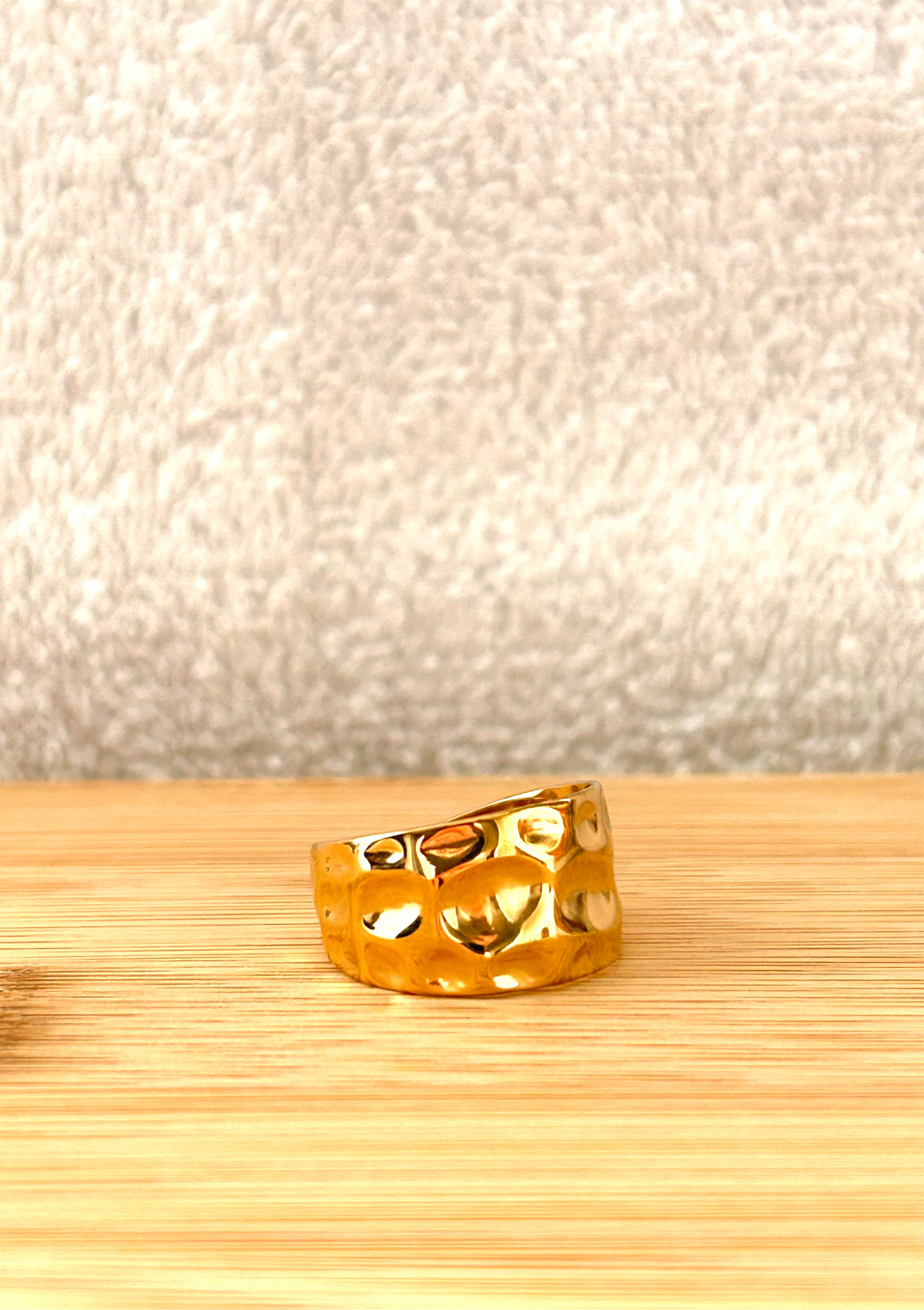Affirmez votre style avec cette bague en acier inoxydable doré à finition martelée. Ornée de trois perles blanches élégantes, elle allie sophistication et modernité. Ajustable pour un confort parfait.