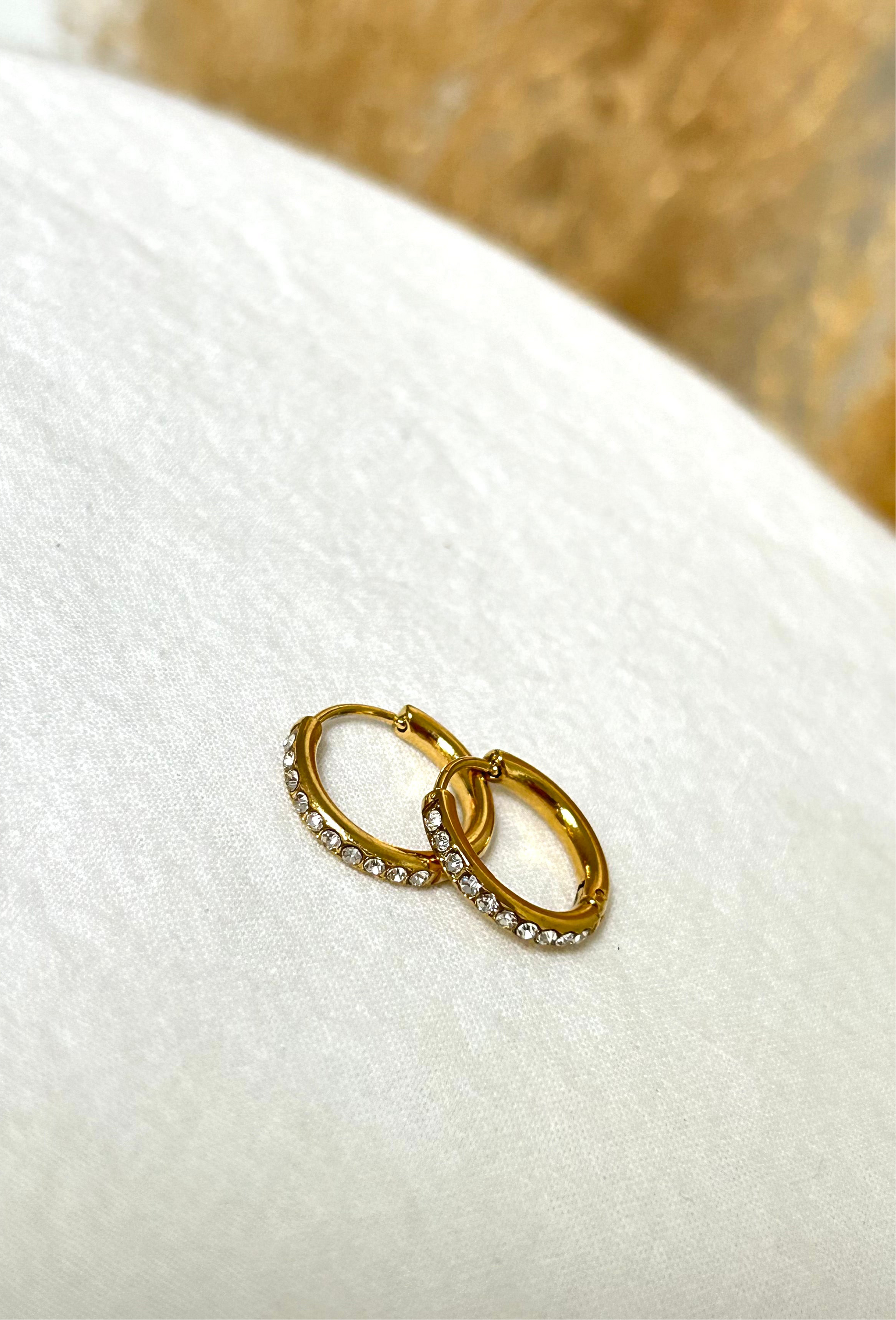 Apportez une touche d'élégance et de simplicité à votre look avec ces créoles dorées serties de strass, un bijou parfait aussi bien pour une tenue de tous les jours que pour une occasion spéciale.