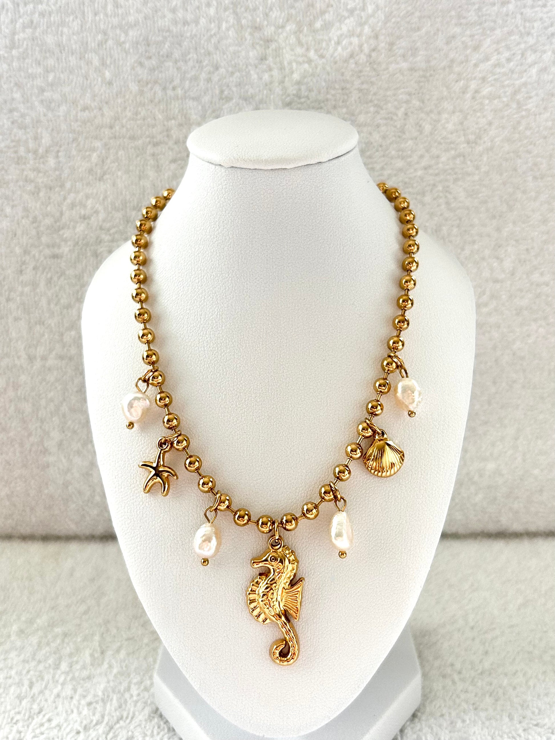 Découvrez ce magnifique collier en acier inoxydable au design marin élégant ! Composé de perles dorées scintillantes, il est orné de charmants pendentifs en forme d’étoile de mer, de coquillage et d’un superbe hippocampe central, sublimé par des perles blanches délicates. Parfait pour ajouter une touche de sophistication et d’originalité à votre style, ce bijou unique est idéal pour toutes les occasions.